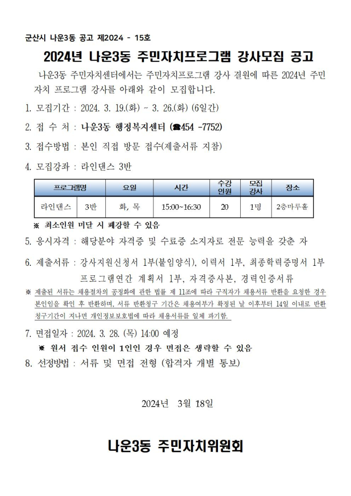 | 12 | 2024년 나운3동 주민자치프로그램 라인댄스 강사모집 |
