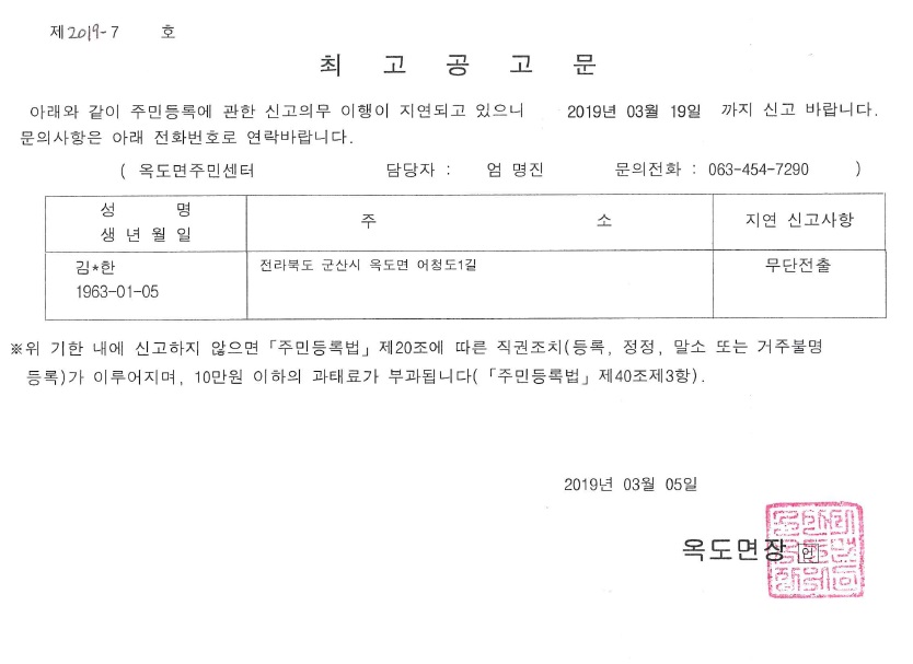 | 2 | 2019년 주민등록 사실조사 무단전출자 최고공고 |