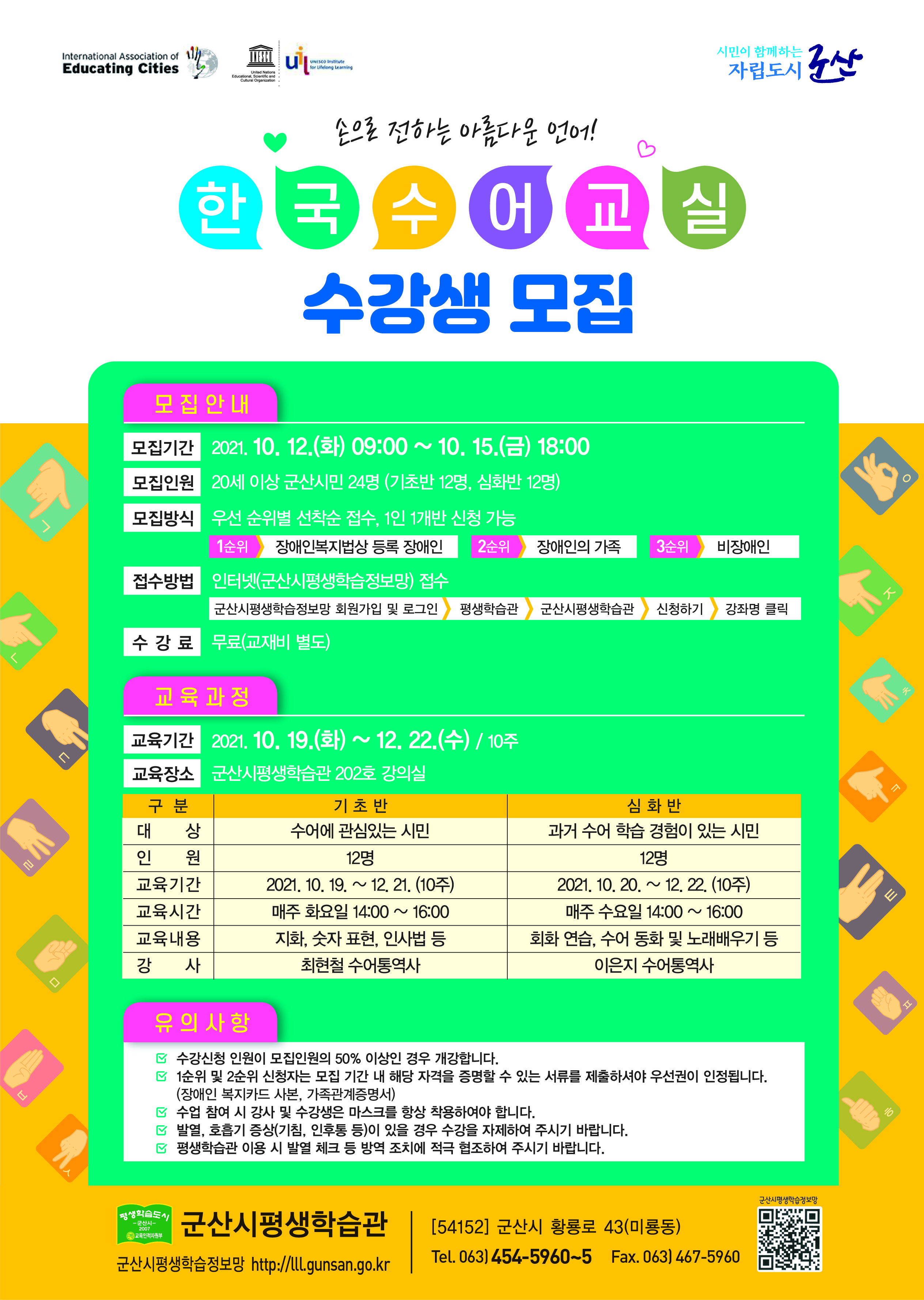 군산시평생학습관에서는 장애인과 더불어 사는 평생학습도시 조성을 위하여 한국수어(수화)교실을 운영합니다.