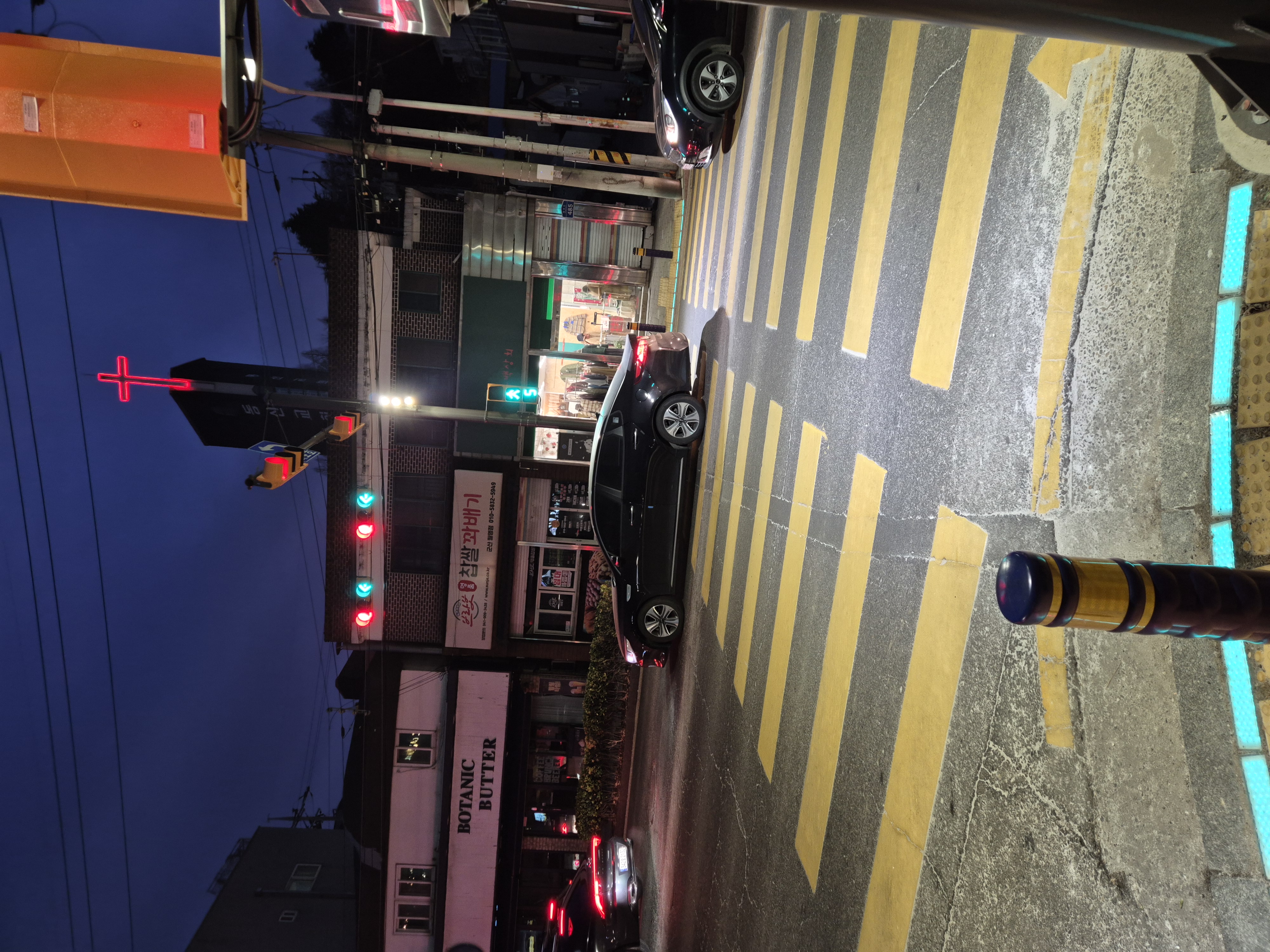 보행자신호가 켜져도 직진차량들 횡단보도 위에 정차중이어서 차를 피해 건너가야하고.