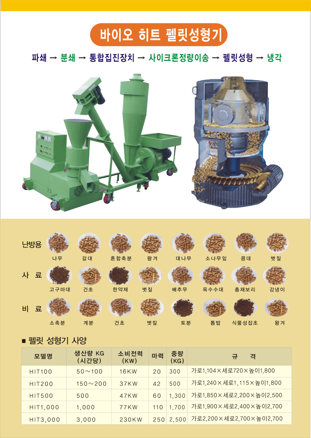이 성형기를 통해서 쓰시고자 하는 용도에 맞게 펠렛 보일러 연료로 쓸 수 있고, 사료로도 쓸 수 있고, 유기농 비료로도 사용 할 수 있습니다.