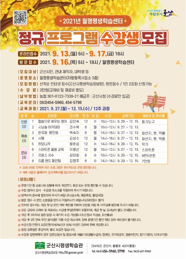 □ 모집방법 : 선착순 인터넷 접수(군산시평생학습정보망), 방문접수(월명평생학습센터)