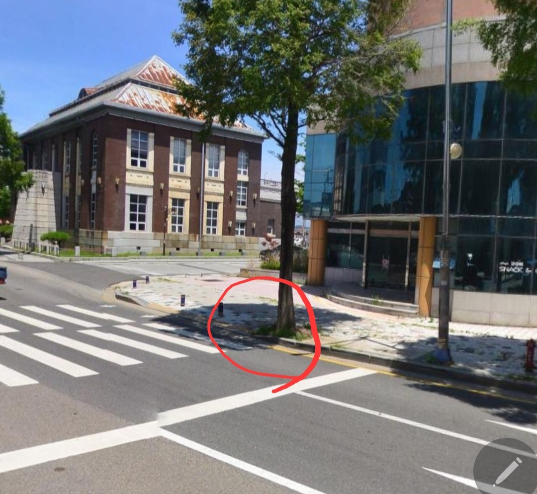 사진을 보시면 군산근대건축박물관 횡단보도 구역입니다. 도로가 갑자기 좁아지면서 굽어 있어 사고가 나기 쉬운지역입니다. 이미 인도 경계석에 차바퀴가 부딪힌 자국이 있습니다. 여기 도로를 넓고 직선으로 개선부탁드립니다.