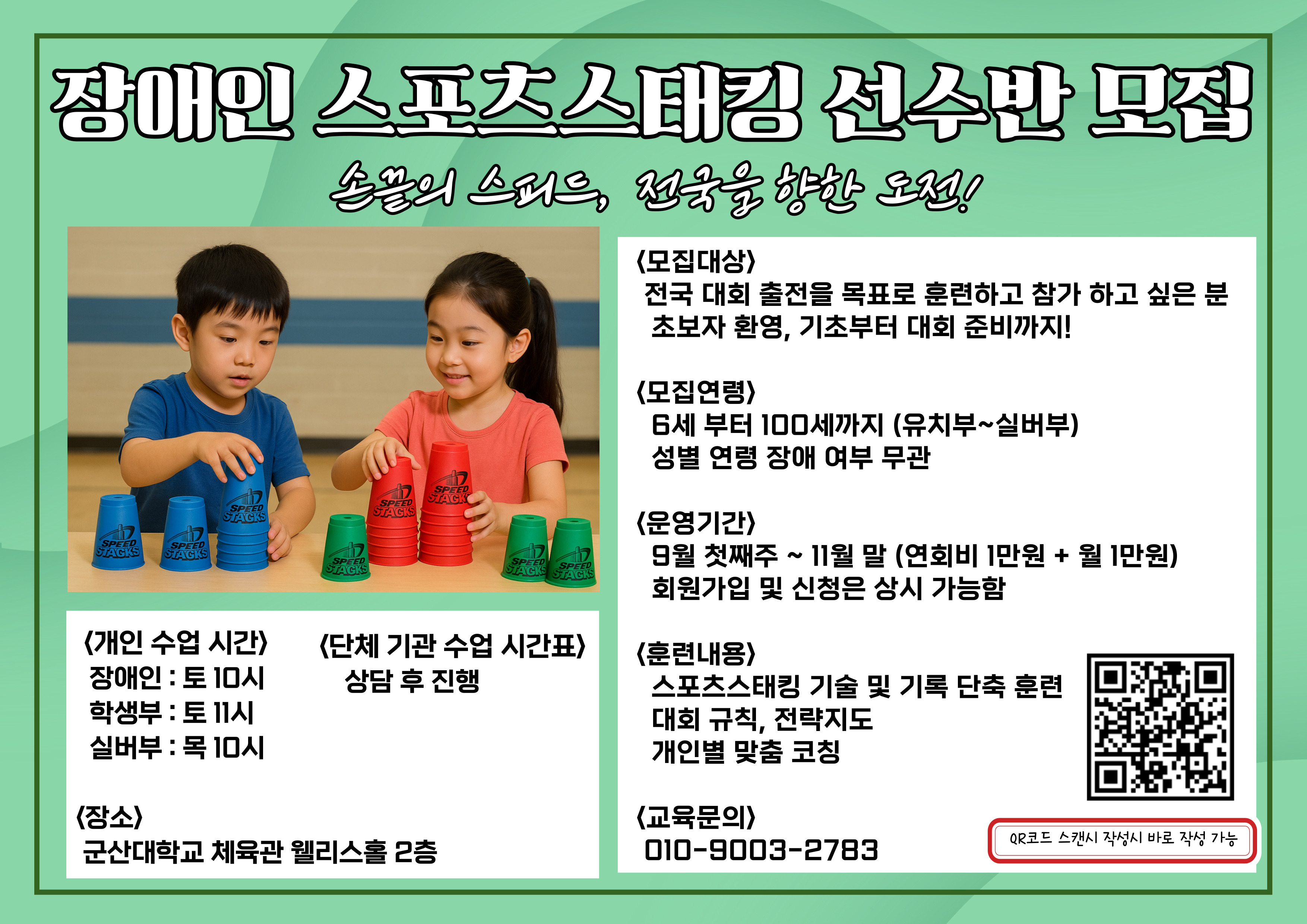 - 모집대상 : 스포츠스태킹을 배우고 싶은 누구나 *연령 6세이상, 장애 여부 무관