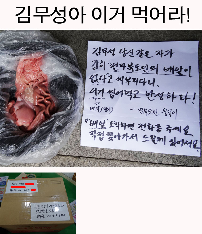 (돼지)창자 한 봉지를 사서 김무성 사무실로 발송했습니다.(사진) 전북도민들 이라면 속창아리