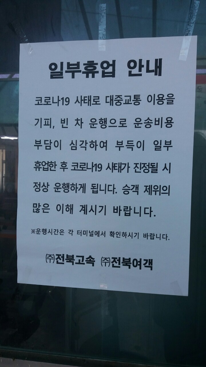 전북고속 운행 휴업 실행 코로나19으로 운행합니다