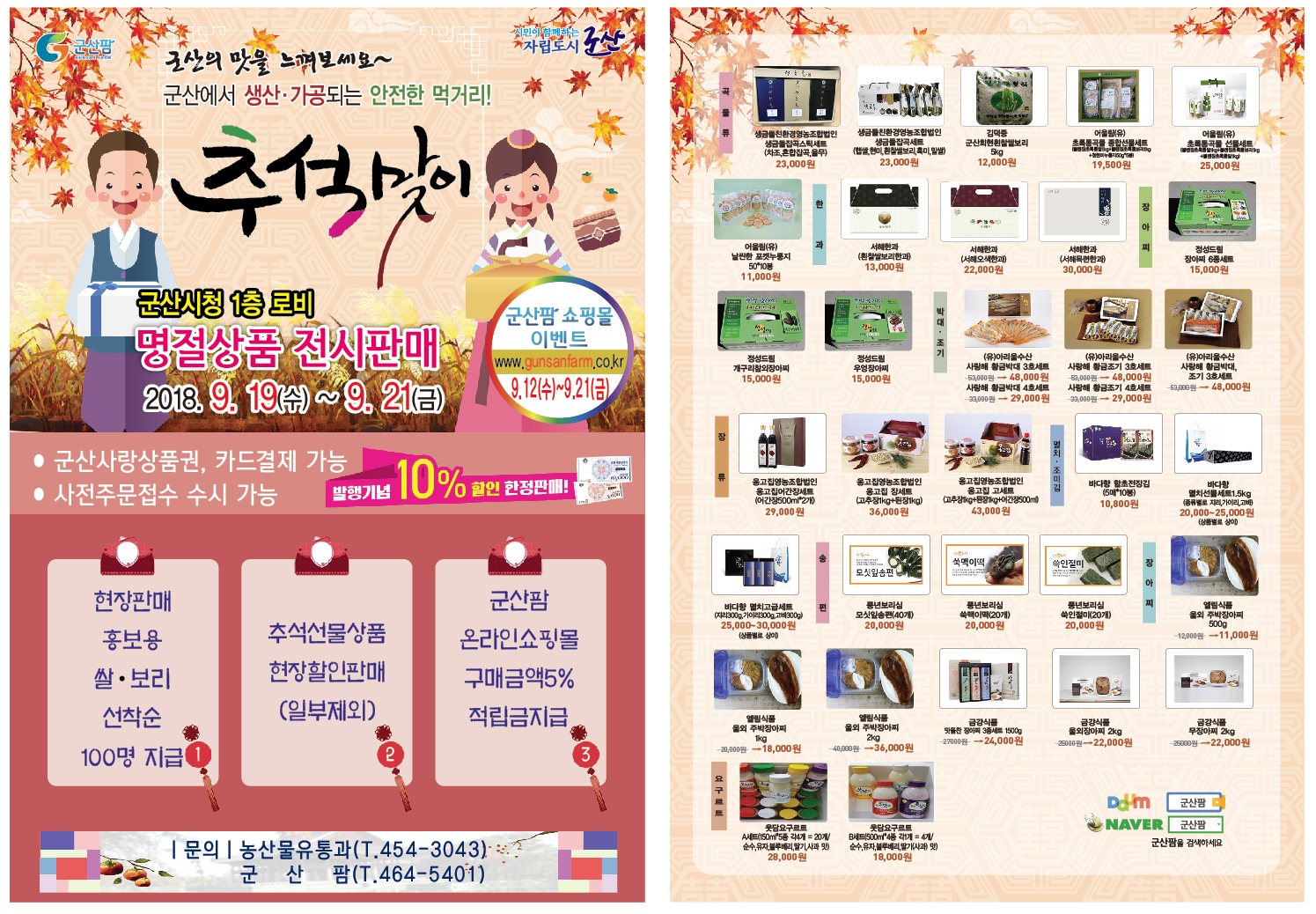 ▣ 2018년 추석맞이 군산팜 명절선물 상품 전시·판매 1) 기 간 :‘18. 9. 19(수) ~ 9. 21(금)/ 3일간 - 사전주문기간 :‘18. 9. 5(수) ~ 9. 13(목)/ 9일간 2) 장 소 : 군산시청 1층 로비 3) 주문접수 : 현장주문(카드결제, 군산사랑 상품권 가능) 4) 군산팜홈페이지(www.gunsanfarm.co.kr)이벤트실시 : 18.9.12~ 9.21