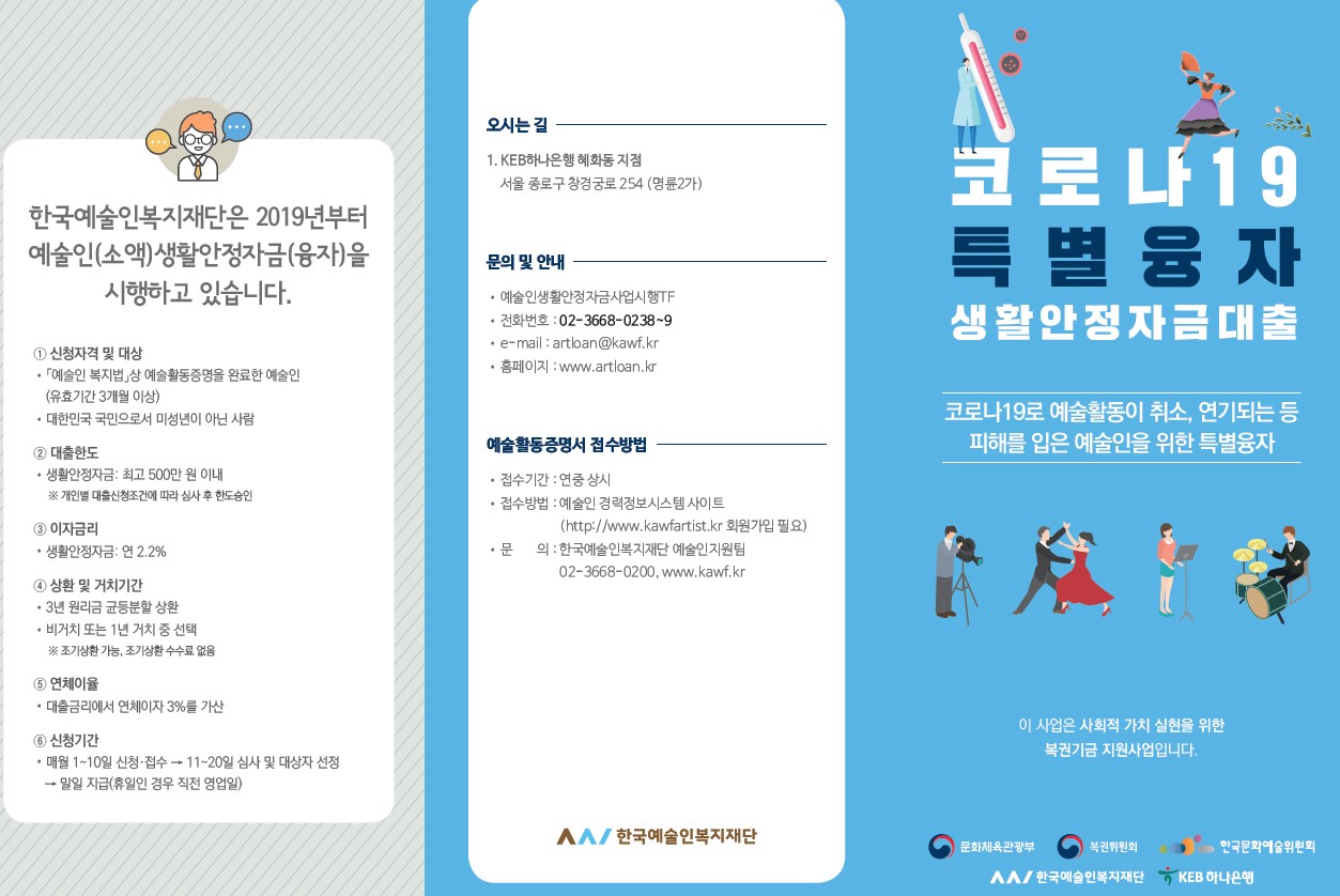 o 지원사업 : 예술인 창작준비금 지원(3.20마감), 코로나19특별융자, (소액)생활안정자금대출, 전세자금대출