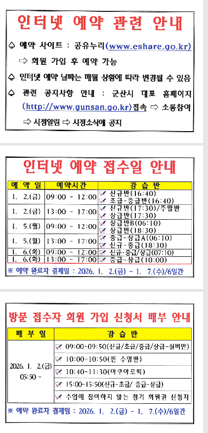2. 인터넷 예약 접수일 : (성인반) - 2026. 1. 5.(월) ~ 1. 6.(화) / (어린이반)- 2026. 1. 2.(금) *첨부파일 참조