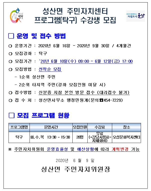 | 13 | 2020년 성산면 주민자치센터 프로그램(탁구) 수강생 모집 (6.10~6.12) |