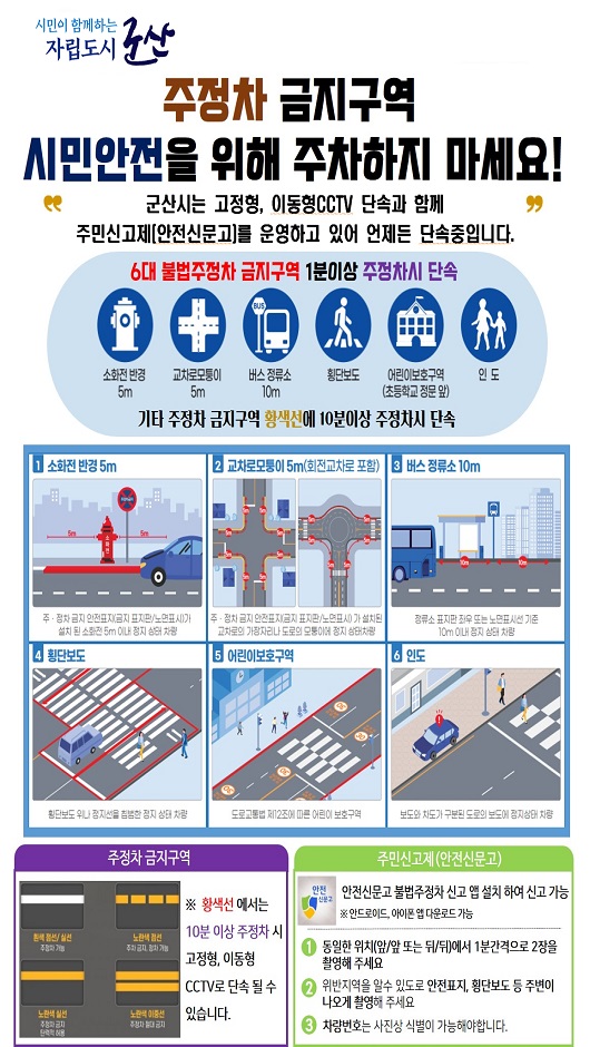6대 주정차 금지구역: 소방시설, 횡단보도, 버스정류장, 교차로, 어린이 보호구역, 인도