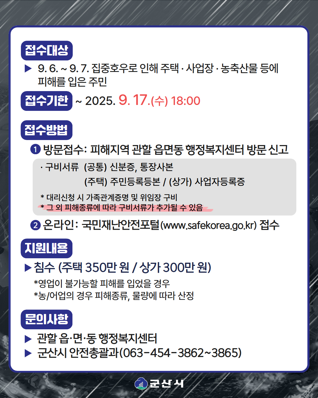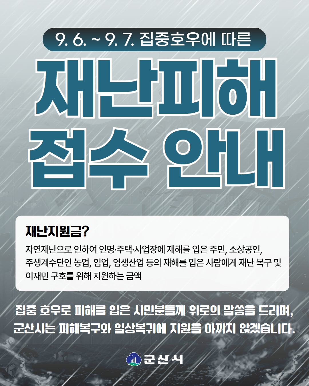 9월6일 ~ 7일간 집중호우로 인해 주택, 사업장, 농축산물에 피해를 입은 주민분들께서는