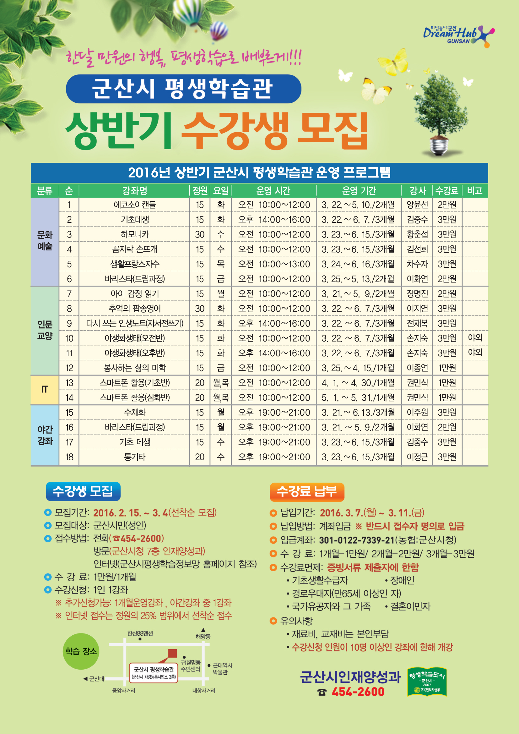 * 접수방법 : 선착순 - 전화, 방문(시청 인재양성과), 인터넷