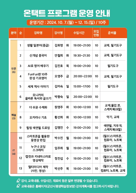 2024년 군산시평생학습관 온택트 3기 프로그램 수강생 모집