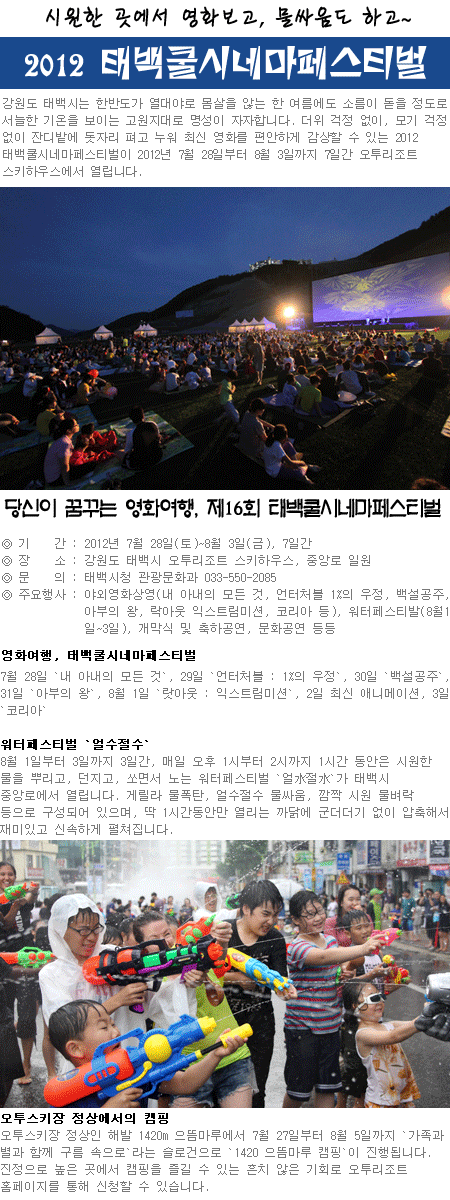 강원도 태백시는 한반도가 열대야로 몸살을 않는 한 여름에도 소름이 돋을 정도로 서늘한 기온을 보이는 고원지대로 명성이 자자합니다. 더위 걱정 없이, 모기 걱정 없이 잔디밭에 돗자리 펴고 누워 최신 영화를 편안하게 감상할 수 있는 2012 태백쿨시네마페스티벌이 2012년 7월 28일부터 8월 3일까지 7일간 오투리조트 스키하우스에서 열립니다.