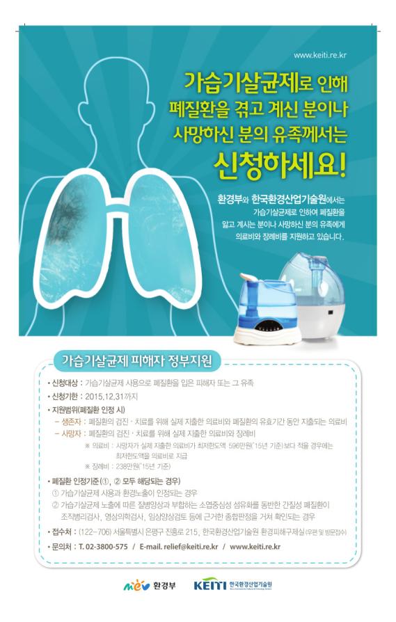 가습기살균제 사용으로 인하여 피해를 입었다고 생각되나, 기존 피해 조사에 참여하지 못하셨던 분들은 ‘15.12.31(목)까지 한국환경산업기술원으로 폐질환 인정 신청을 하시기 바랍니다.