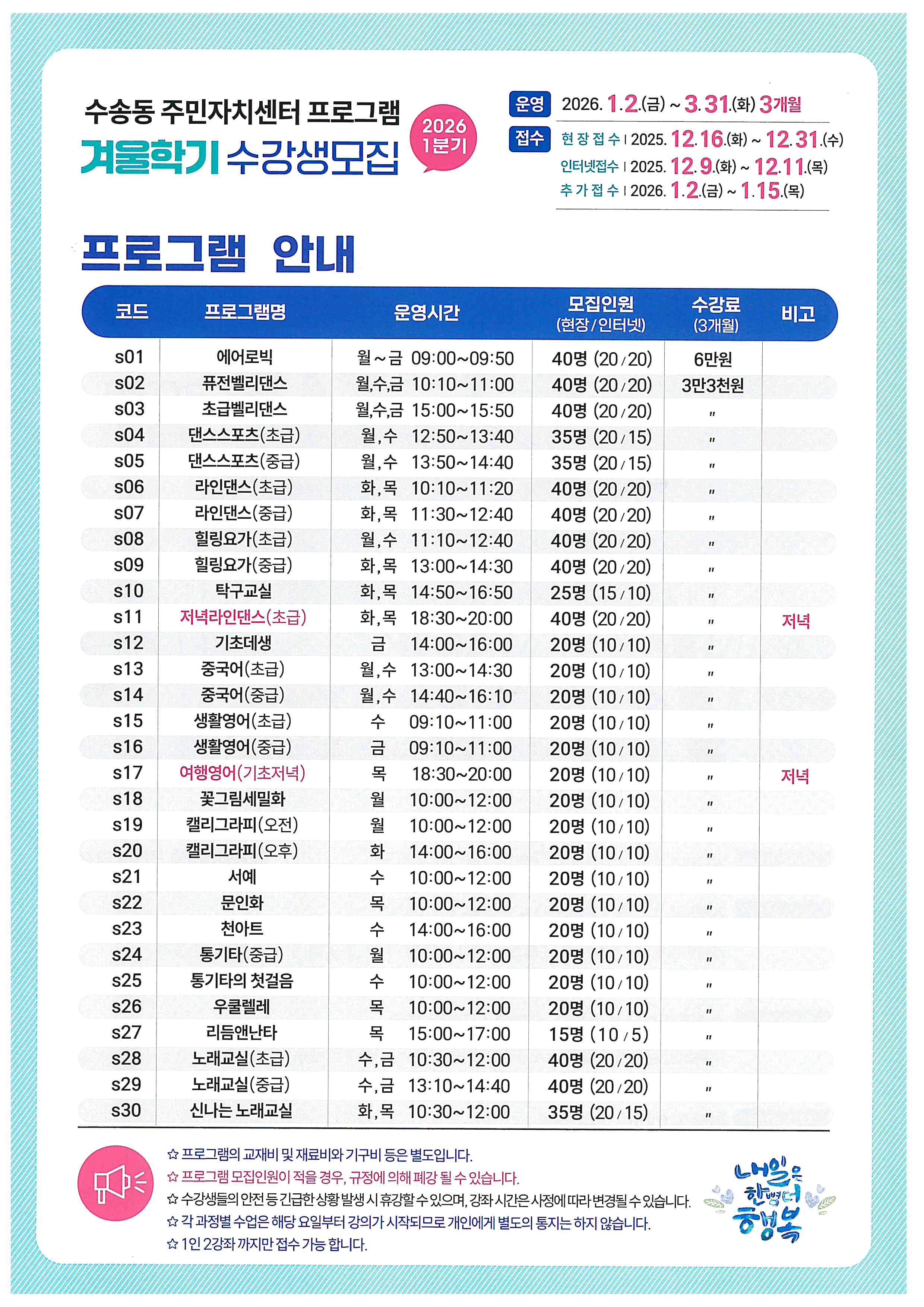 2026년 1분기 수송동 주민자치센터 프로그램 수강생을 다음과 같이 모집 공고하고자 합니다.