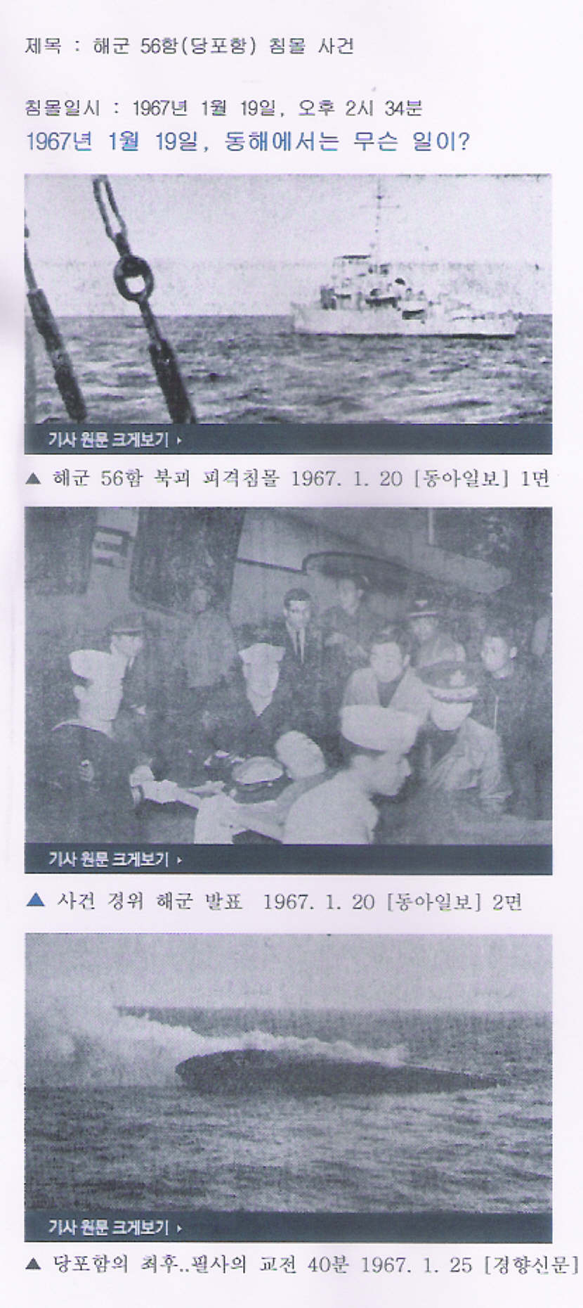 한낮이었다. 태양이 뻔히 내려다보고 있었다. 날은 구름 한 점 없이 맑았다. 바다엔 풍랑도 별로 없었다. 그 멀쩡한 시간, 대한민국 해군 56함은 시커먼 연기를 내뿜으며 바다로 침몰하고 있었다. 강원도 금강산이 보이는 어로저지선 인근 해상이었다. 1967년 1월19일, 정확히 오후 2시34분이었다.