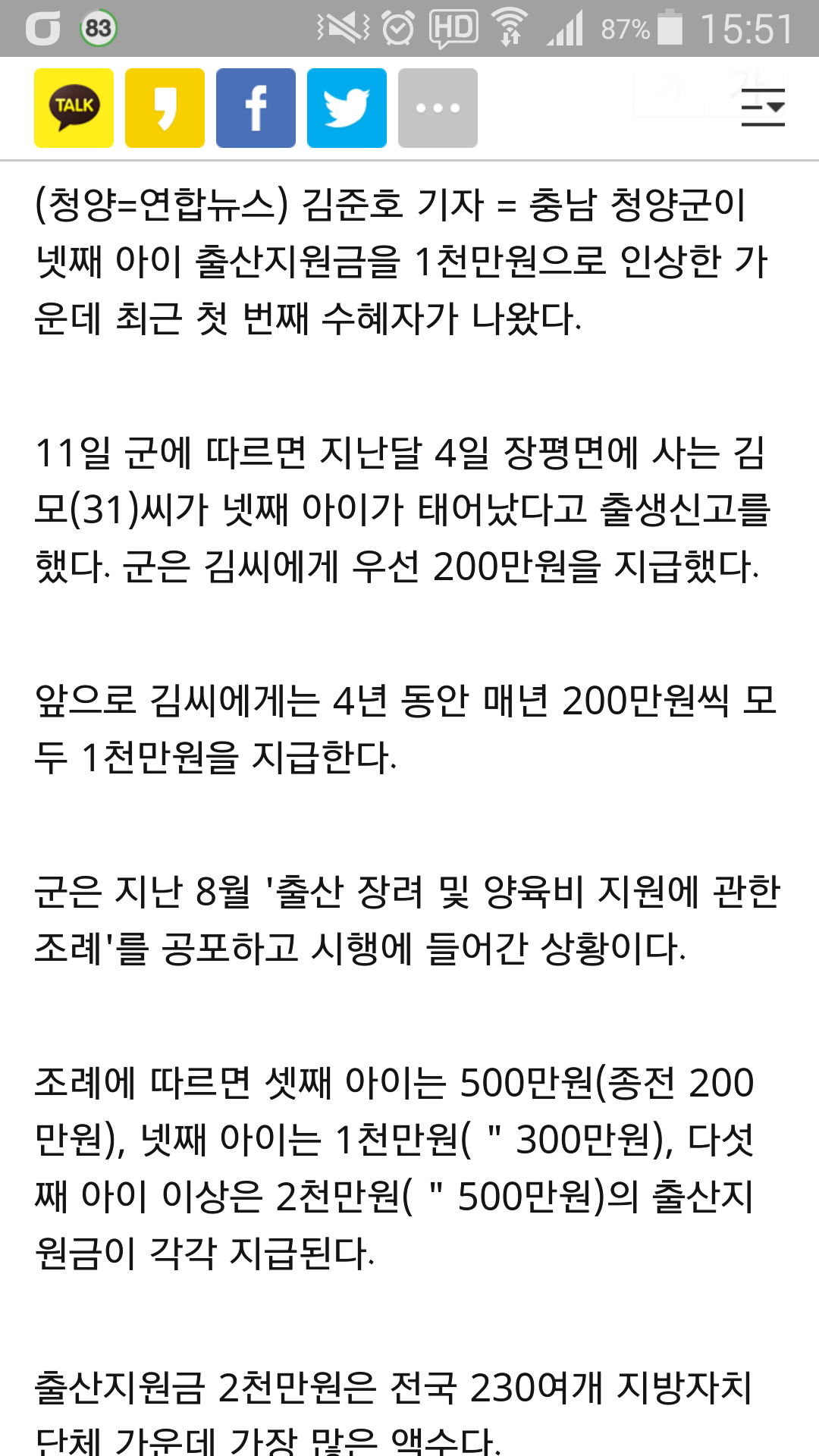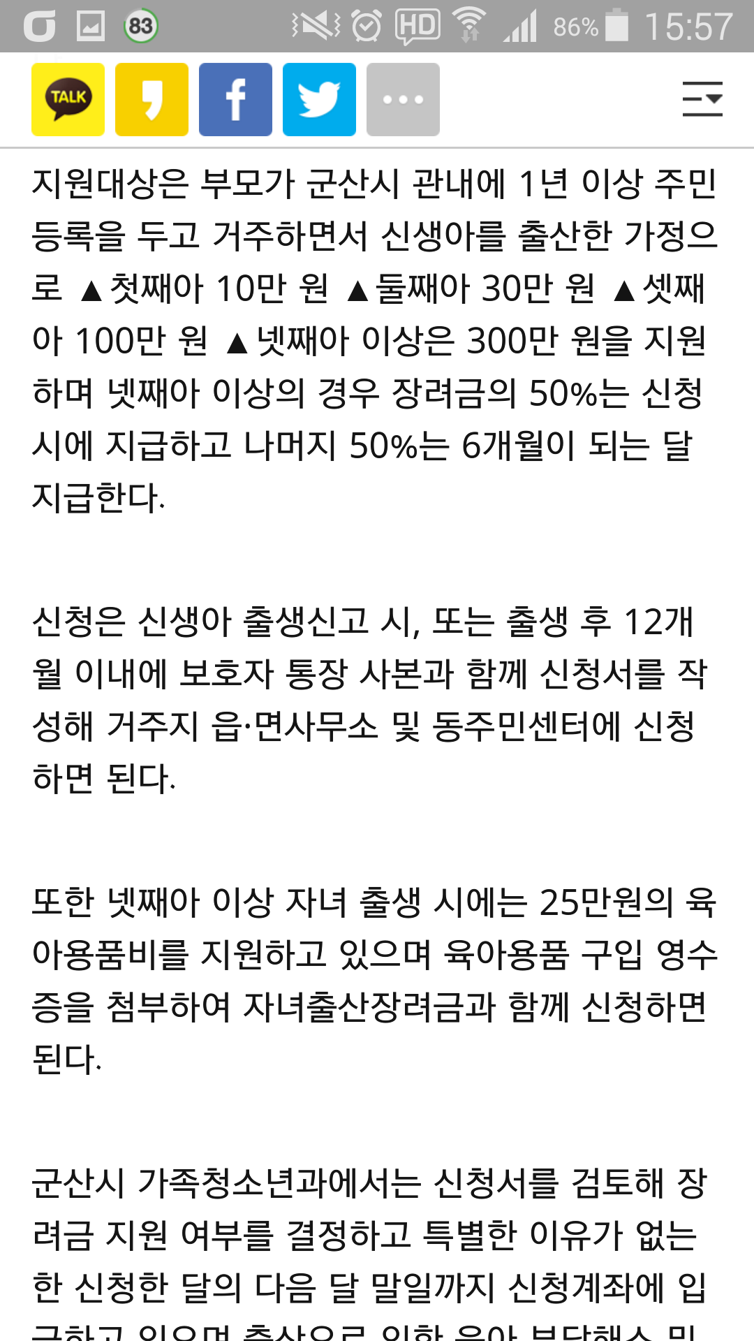 인터넷 신문을 보다가 시에 건의할 사항이 있어 몇자 적어 봅니다.. 요즘 군산에 아파트도 많이 들어서고 나날이 발전되고 있는데요..출산에 관련하여 지원이 많이 부족한거 같습니다.. 한 예로 청야군 출산 장례금을보니 3째아이 출산할경우 1천만원 지원금과 축하금 및 육아용품을 지원해 주던데요..군산은 조금 미흡한거 같습니다..자료 첨부했구요..보시고 좀더 발전된 군산시가 되길 기원합니다..물론 청양군과 군산시 인구차는 많이 나나 미래를 보시고 출산 장려에 힘써주셨슴 합니다..감사합니다