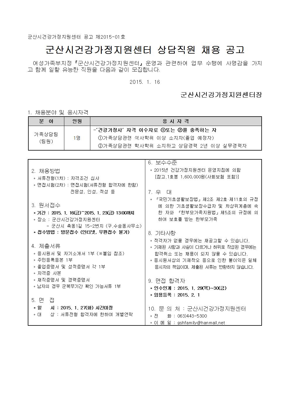 군산시건강가정지원센터 공고 제2015-01호
