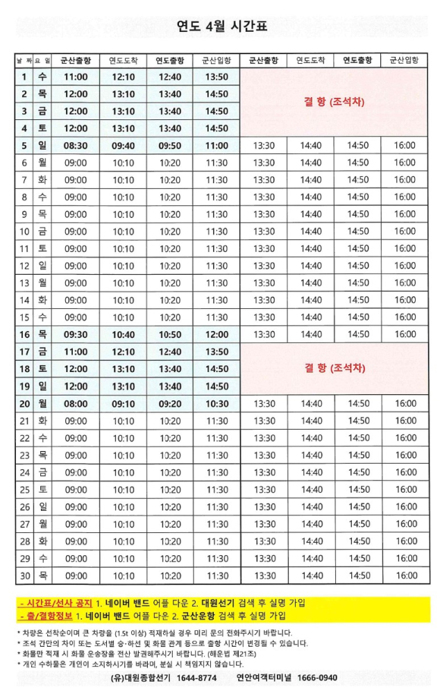 | 811 | 연도 | 2026 | 4 | 연도 4월 여객선 시간표 안내 |