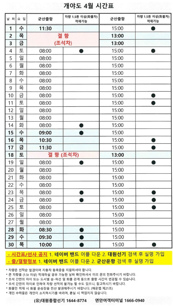 여객선 안내 -군산 연안여객터미널 (유) 대원종합선기 1644-8774 (임해로 378-8)(어청도 개야도 연도)