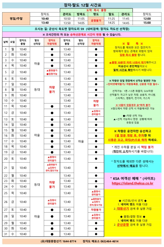 108 장자도 2025 12 장자도 12월 여객선 시간표 안내 첨부파일 있음