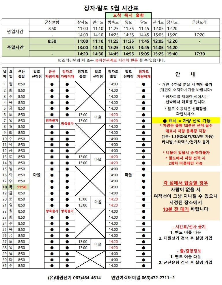 고군산 군도 섬여행 선박 운행 시간표 안내입니다.