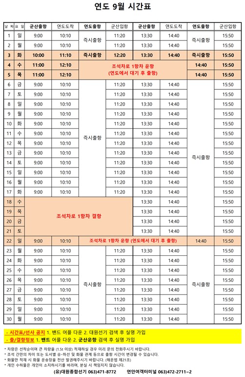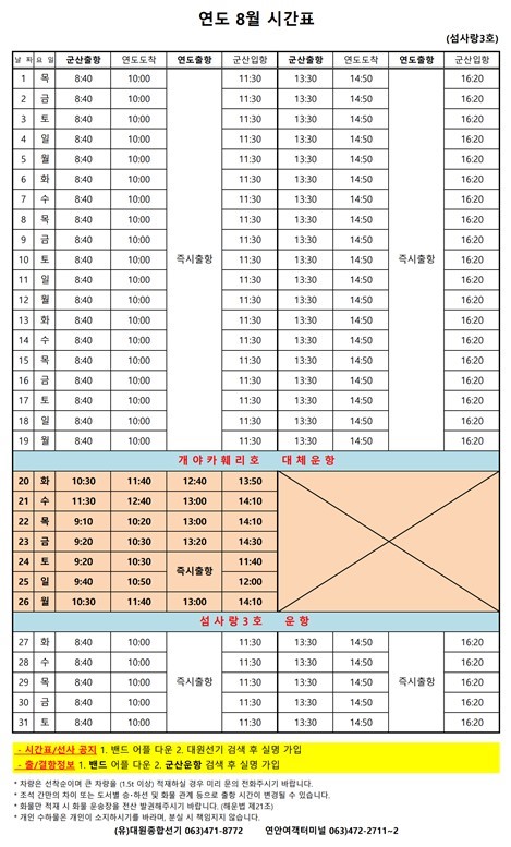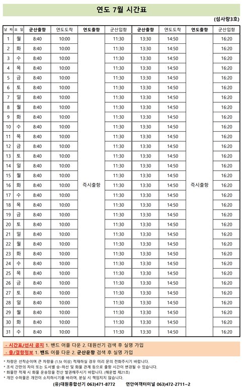 고군산 군도 섬여행 선박 운행 시간표 안내입니다.