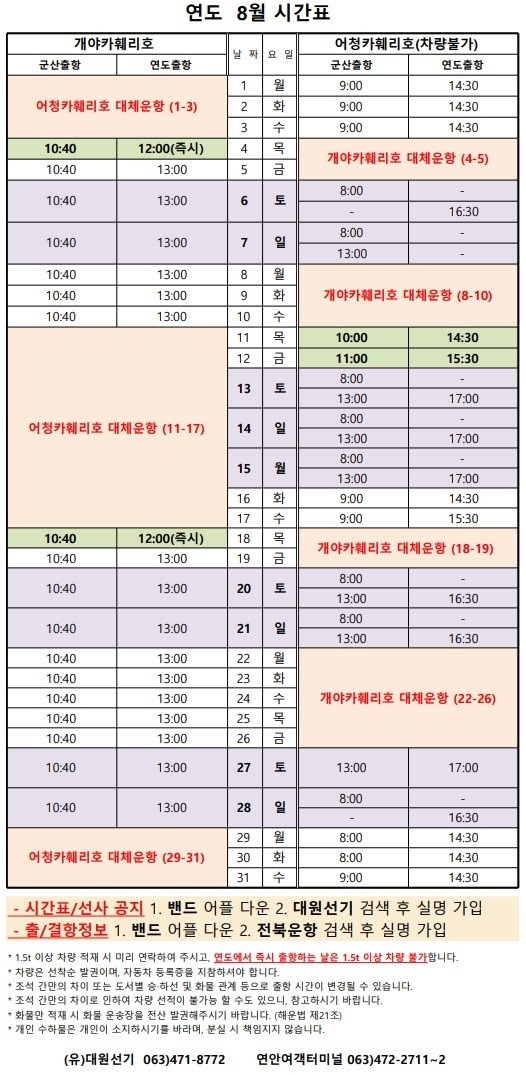 여객선 안내 -군산 연안여객터미널 (유) 대원종합선기 1644-8774 (임해로 378-8)(어청도 개야도 연도)