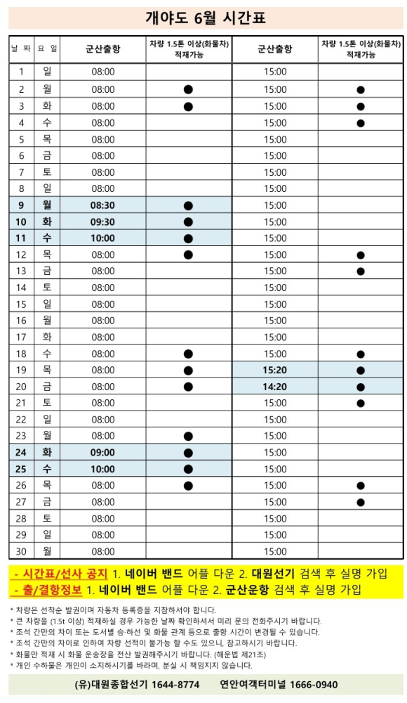 여객선 안내 -군산 연안여객터미널 (유) 대원종합선기 1644-8774 (임해로 378-8)(어청도 개야도 연도)
