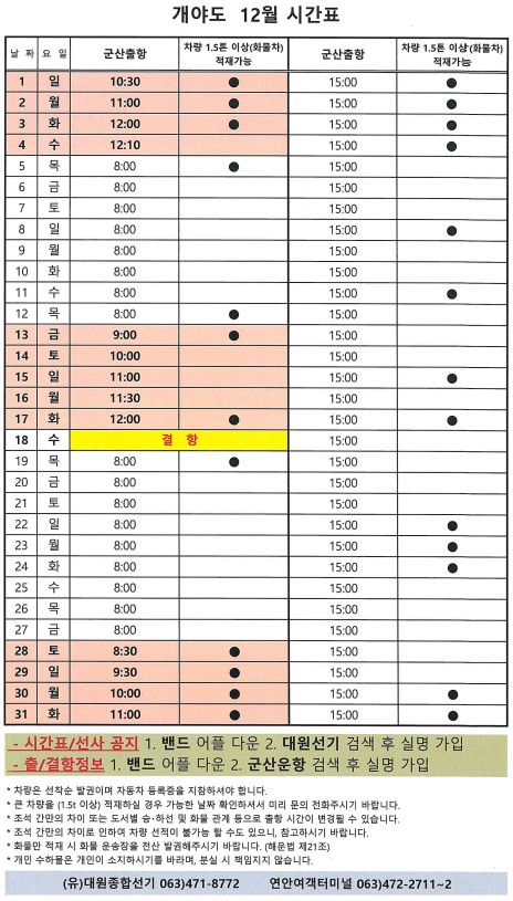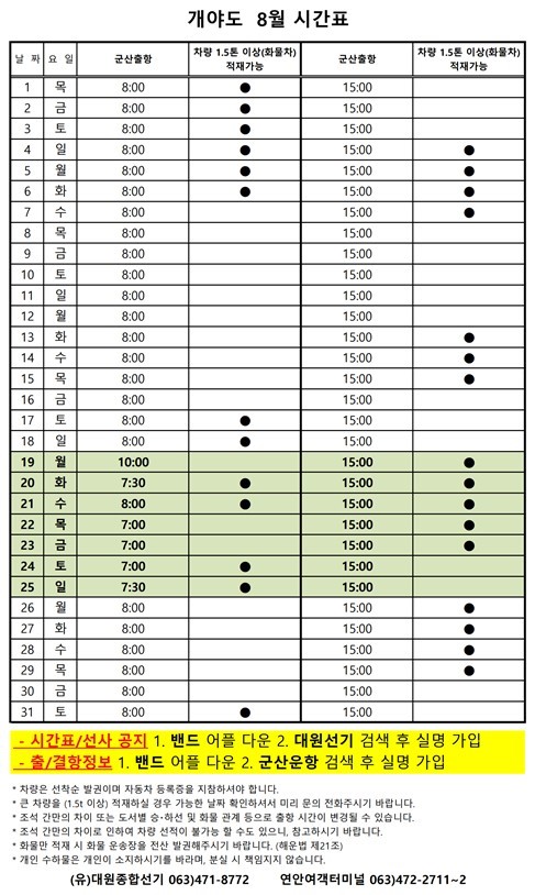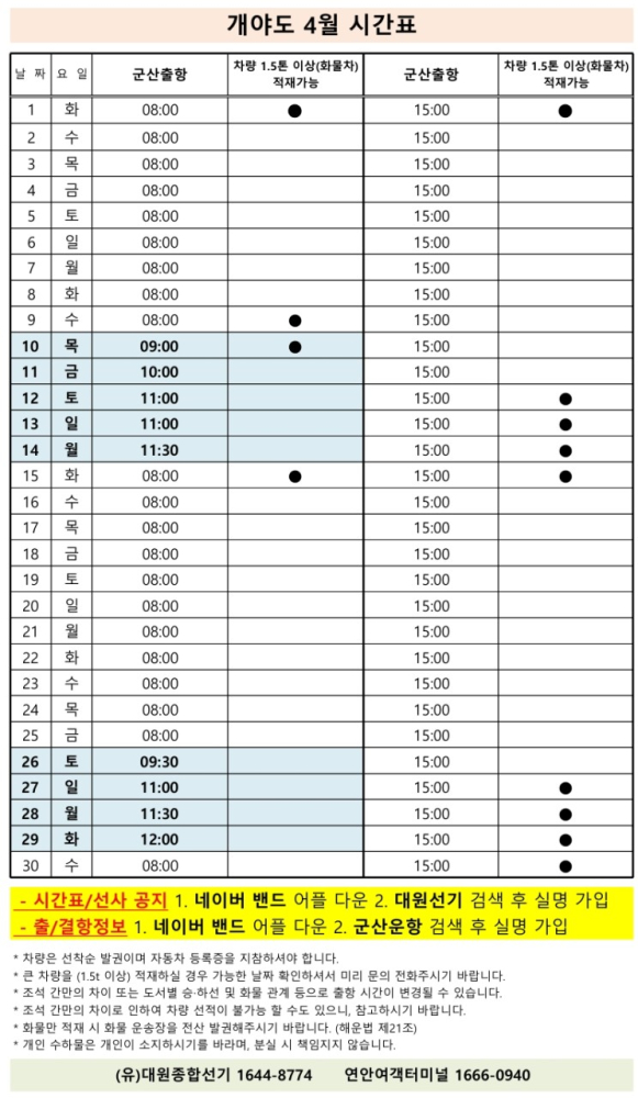 여객선 안내 -군산 연안여객터미널 (유) 대원종합선기 1644-8774 (임해로 378-8)(어청도 개야도 연도)