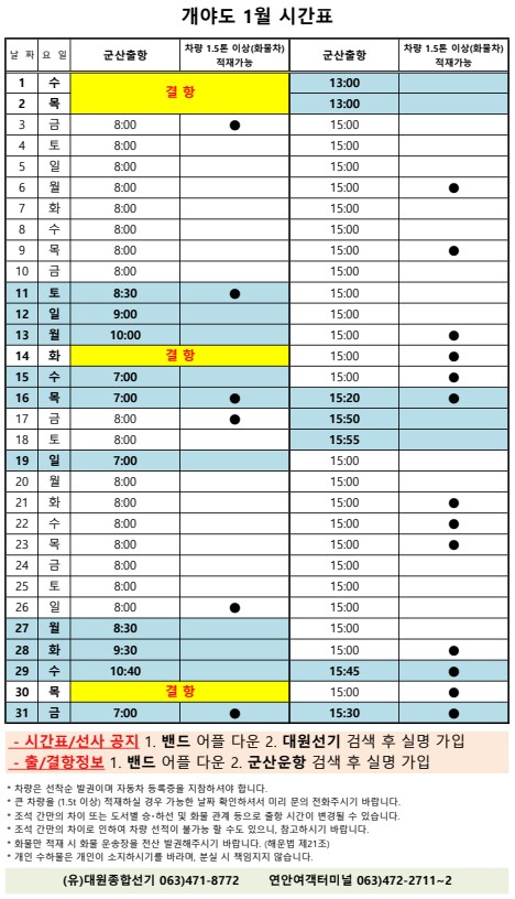 고군산 군도 섬여행 선박 운행 시간표 안내입니다.