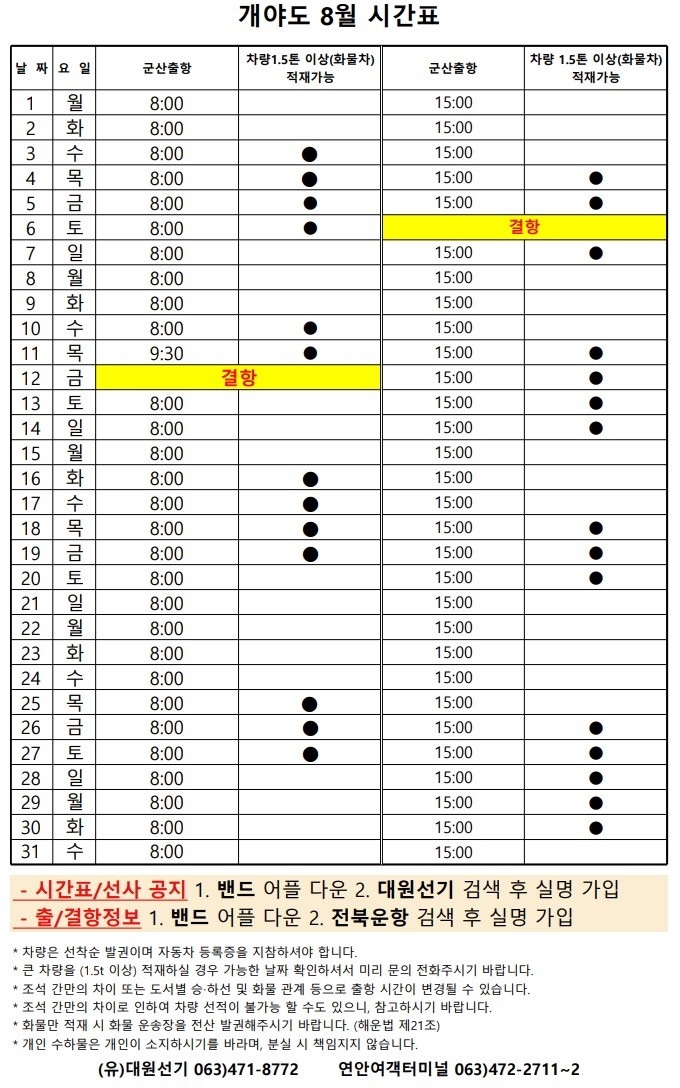 고군산 군도 섬여행 선박 운행 시간표 안내입니다.