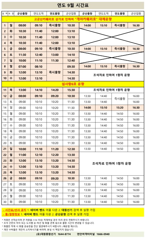 고군산 군도 섬여행 선박 운행 시간표 안내입니다.