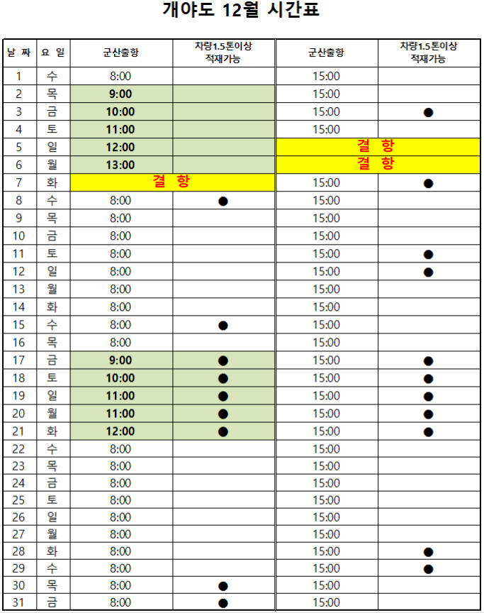 12월 개야도 여객시간표 알림