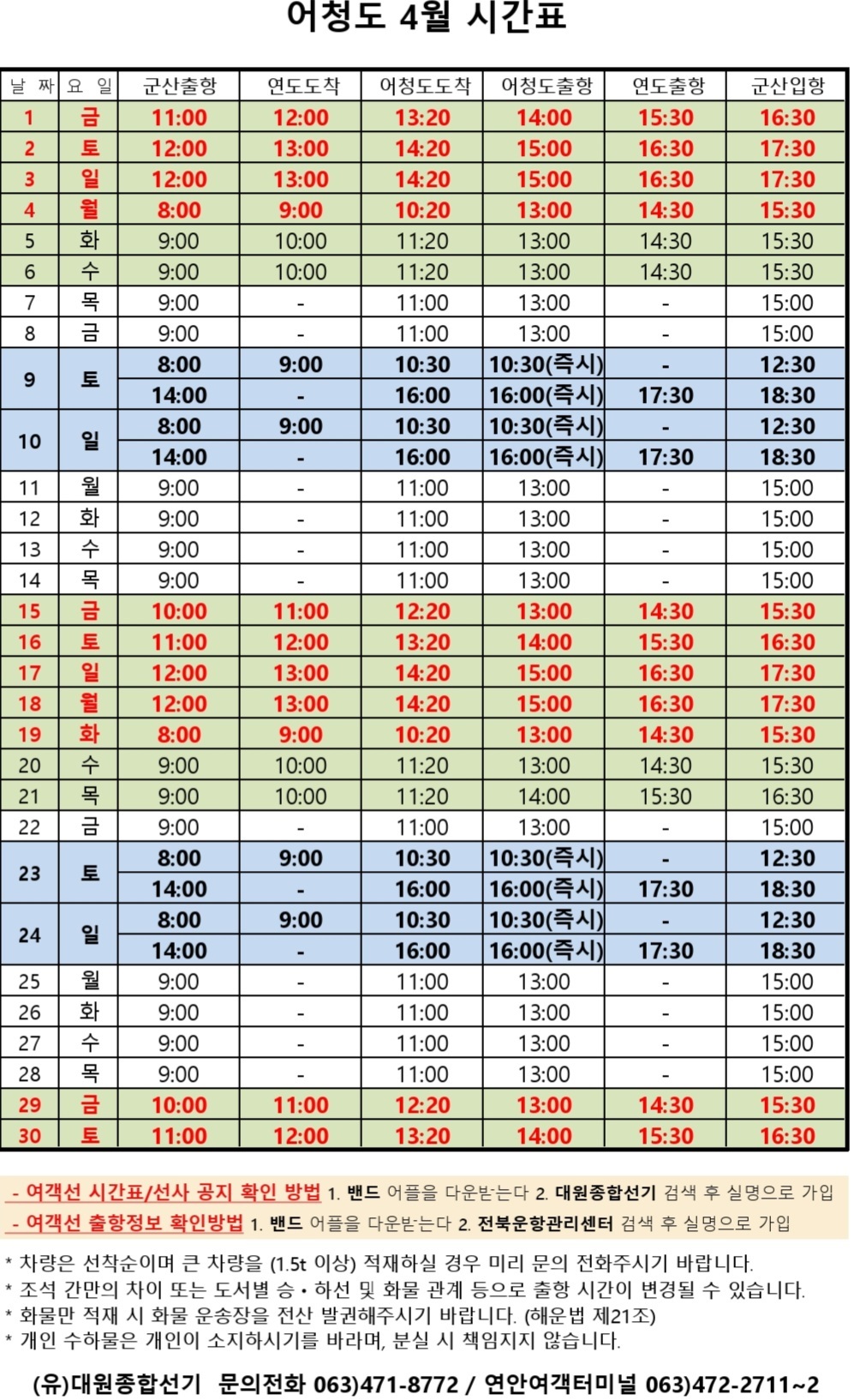 장자도 4월 여객시간표