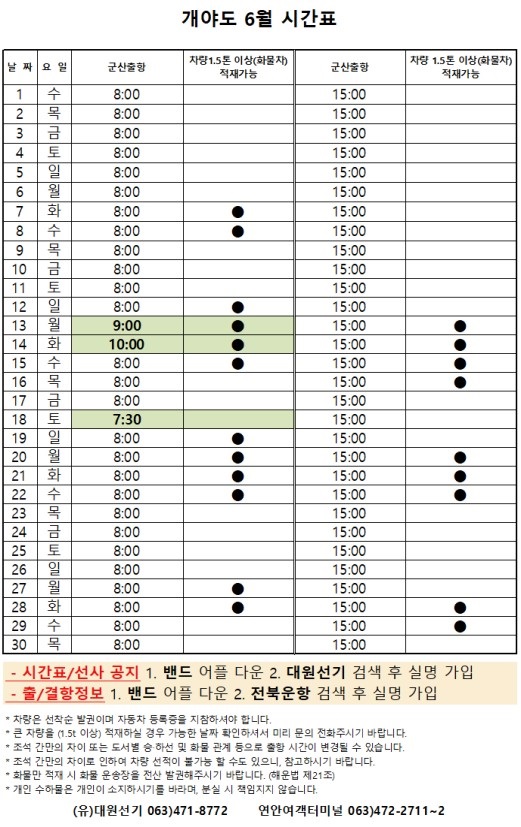 개야도 6월 여객시간표