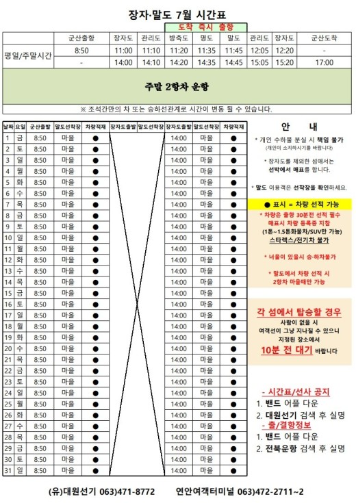 7월 방축도 여객시간표 알림