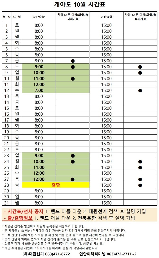 10월 개야도 여객시간표