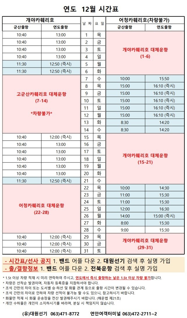 문화관광국 관광진흥과에서 제작한 여객선 시간표 저작물은 "공공누리" 출처표시-상업적 이용금지-변경금지 조건에 따라 이용 할 수 있습니다.