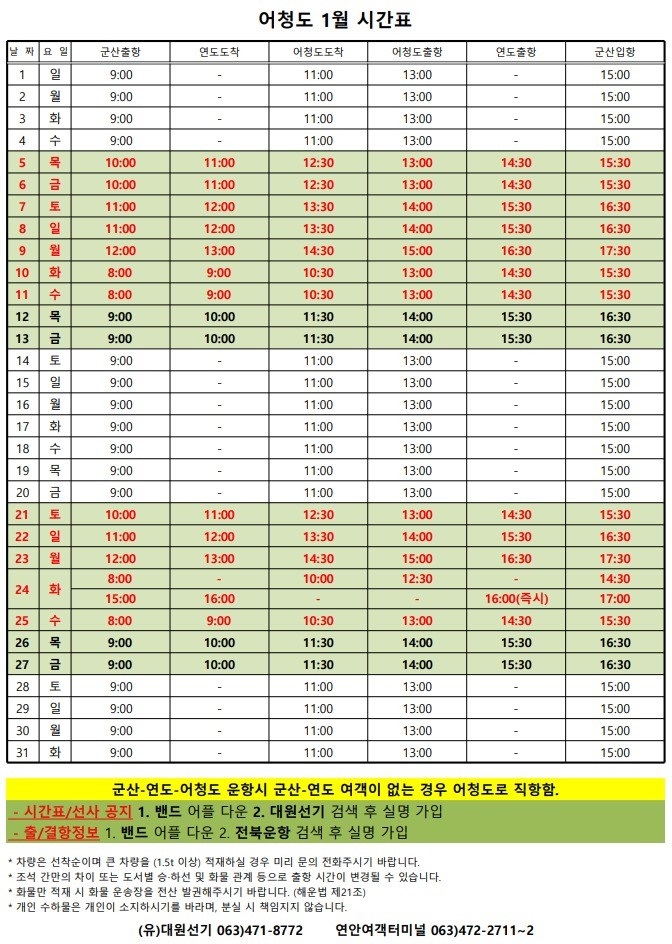 장자도 1월 여객시간표 알림
