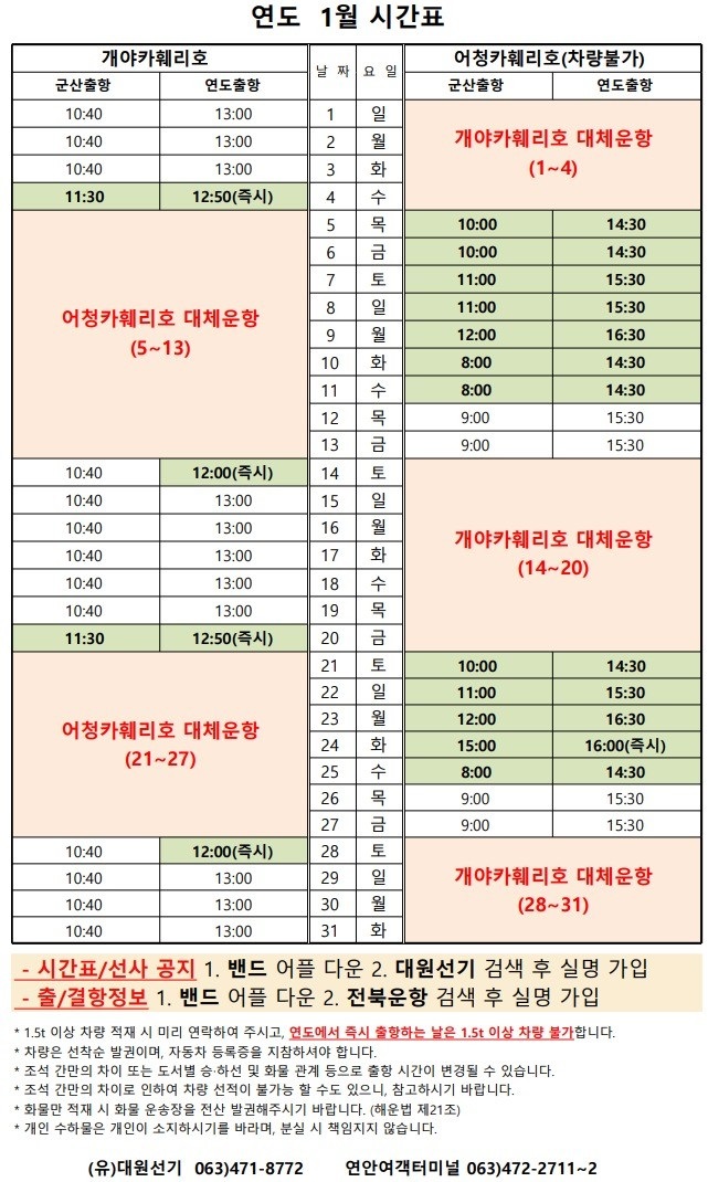 개야도 1월 여객시간표 알림