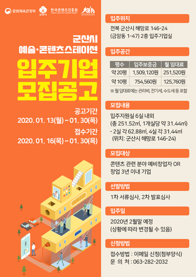 군산시에서는 지역내 문화 콘텐츠 산업의 안정적인 정착기반 마련을 위하여 「군산 예술·콘텐츠 스테이션」입주기업을 모집하고자 합니다. 종합지원시스템 구축, 사업운영 공간 제공 및 다양한 혜택지원 등 선발 기업을 적극 지원하오니 희망하는 분들의 많은 지원 바랍니다.